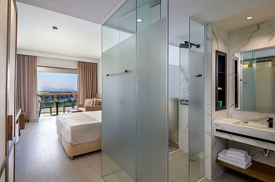 Spread in various parts of the resort, the air-conditioned junior suites have a spacious living room with double sofa bed, and enjoy sea or side view from a furnished balcony. It also includes LCD TV, safe, mini-bar, coffee/tea facilities , bathrobes and slippers. The bathroom is stocked with a shower. Free WiFi is available.